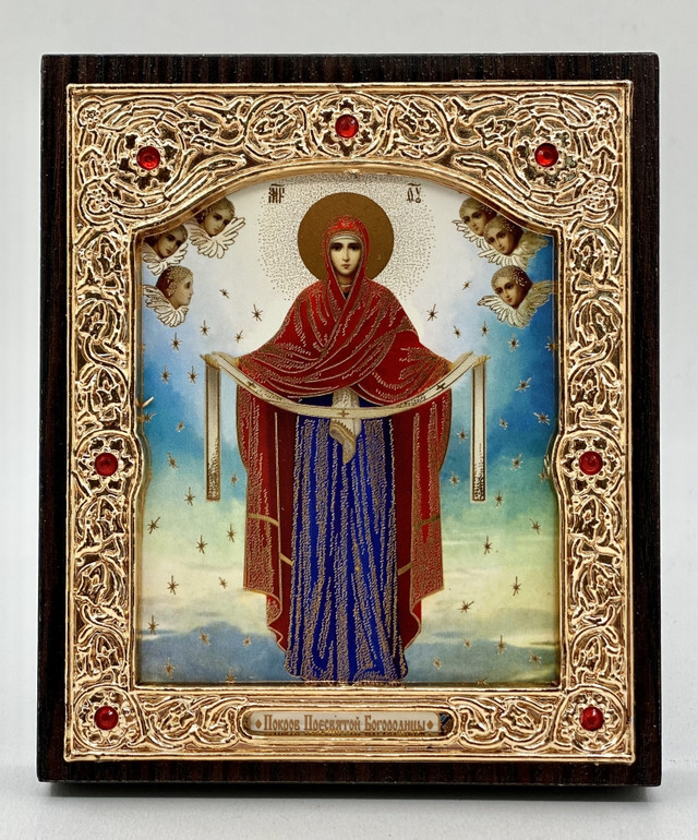 Ікона в обкладі, риза, дерев'яний прямий кіот на підставці "Ікона Покрову Пресвятої Богородиці" Оригінальна робота. Позолочена рамочка. Дерево. У подарунковій упаковці.