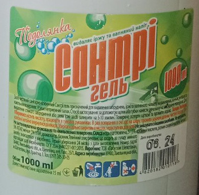 Купуйте САНТРІ ГЕЛЬ "Подоланка" — 100% гарантія блиску та видалення нальоту (вапняний, мильний, лужний та інші типи нальоту), іржі, бактерій, мікроби, уриновий наліт на сантехніці, кахлі тощо. Застосовуйте в побуті без переплат! Чесний 1 ЛІТР.