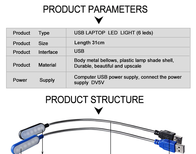 Specification: Item name: USB LED Night Light LED quantity: 6 LEDs Lamp port: USB Voltage: 3.7-5V product length: 31cm Shell Color: black , blue Light color: white Power: power bank, PC, laptop and other USB port device Application: reading book, night light, night lamp, camping, hiking